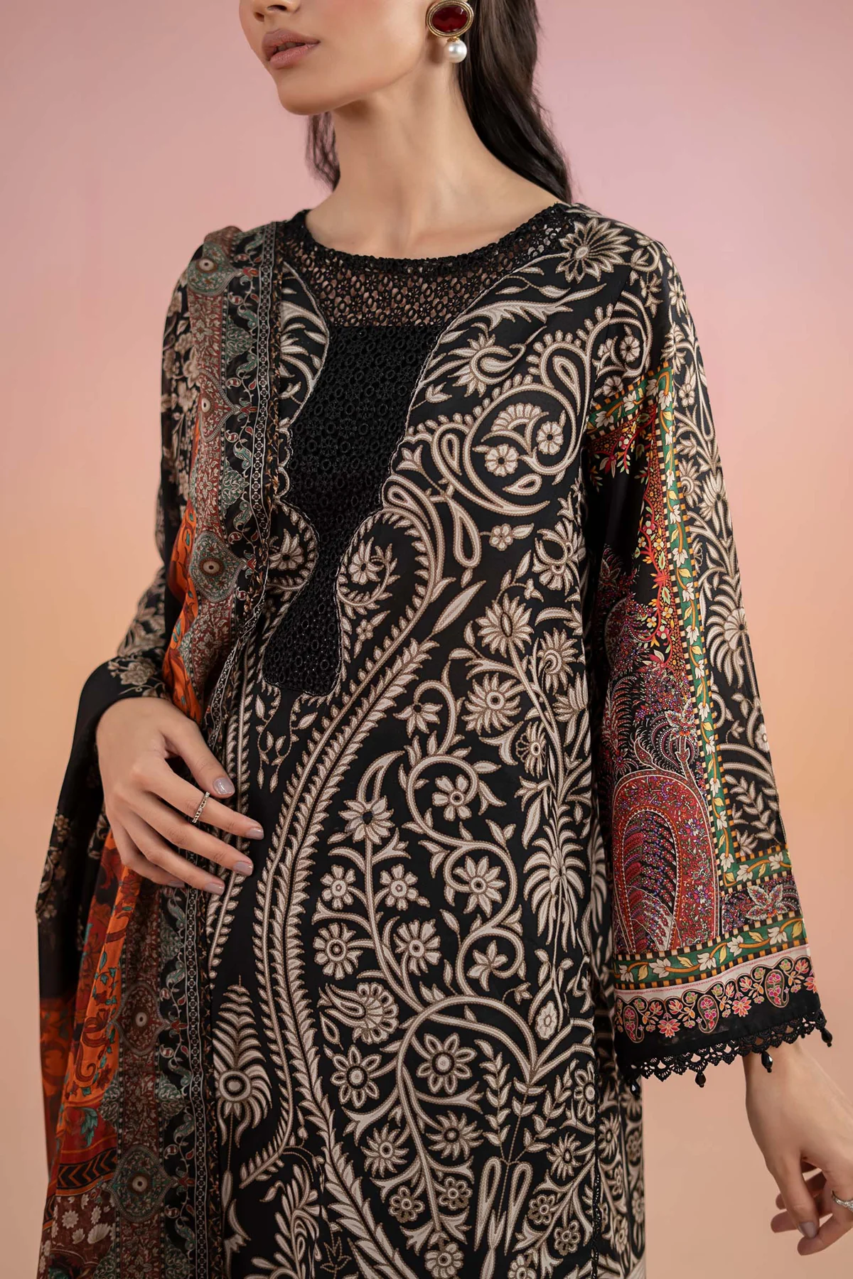Embroidered Border With Lace & Pearl Drop Detailing