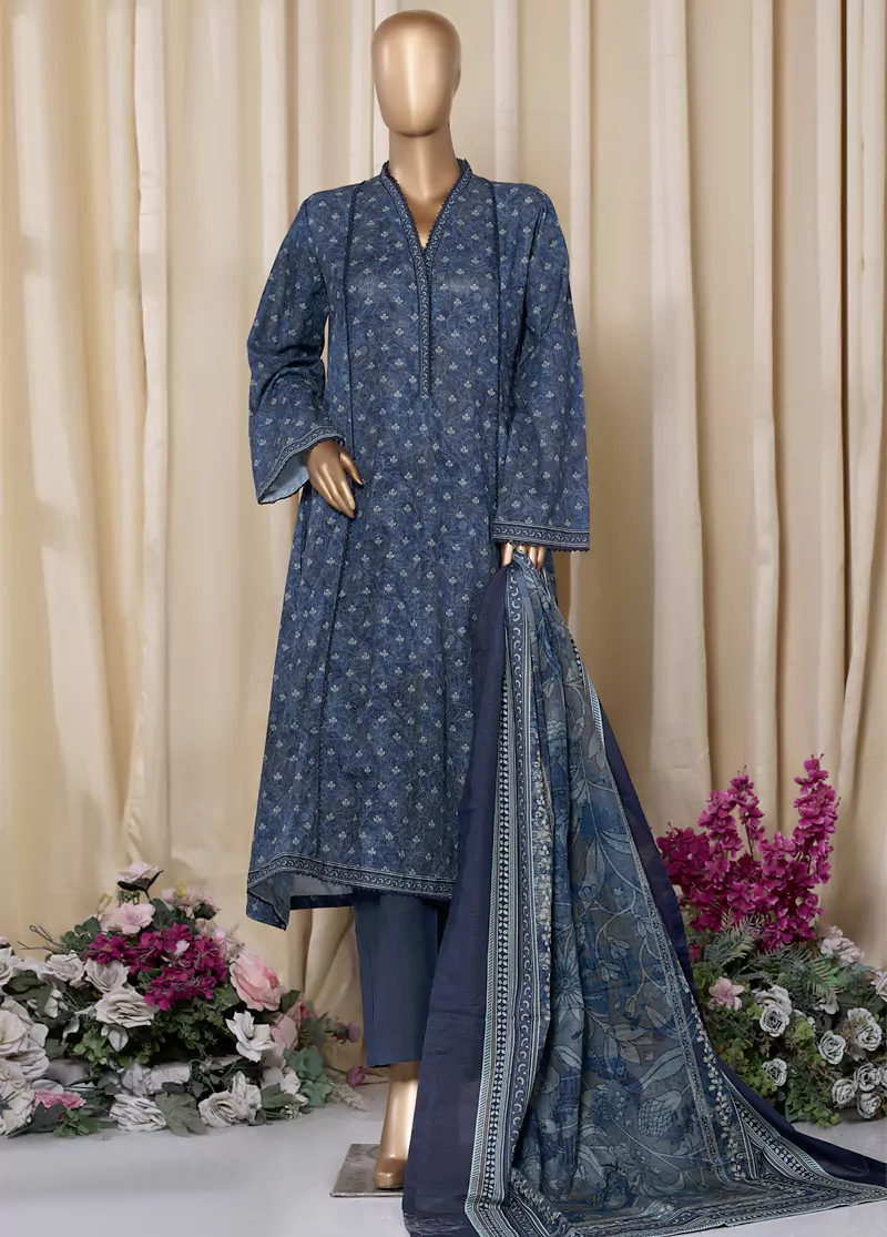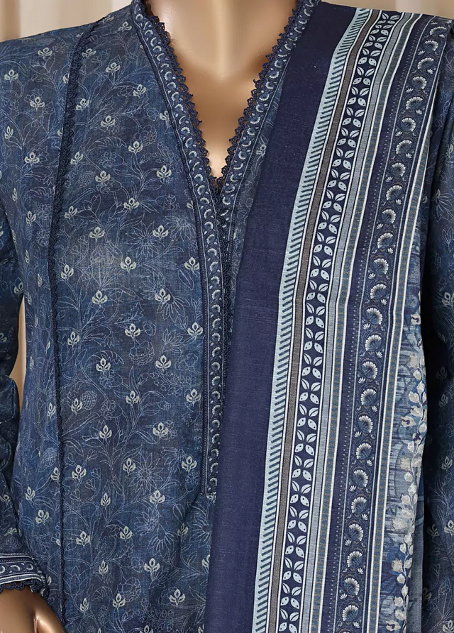 Bin Saeed Fabrics presents a women’s 3 Piece Stitched Printed Suit in navy blue, crafted from comfortable Khaddar fabric ideal for cooler seasons. The set includes a frock-style shirt, straight trousers, and a matching dupatta, all featuring delicate lace work for subtle elegance without embroidery.