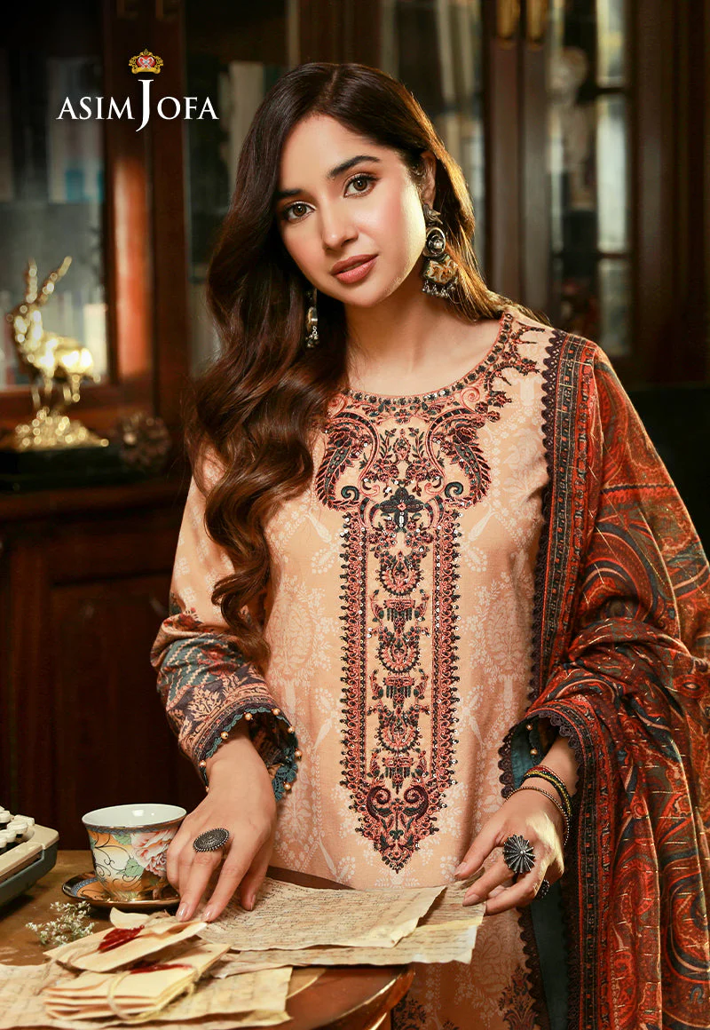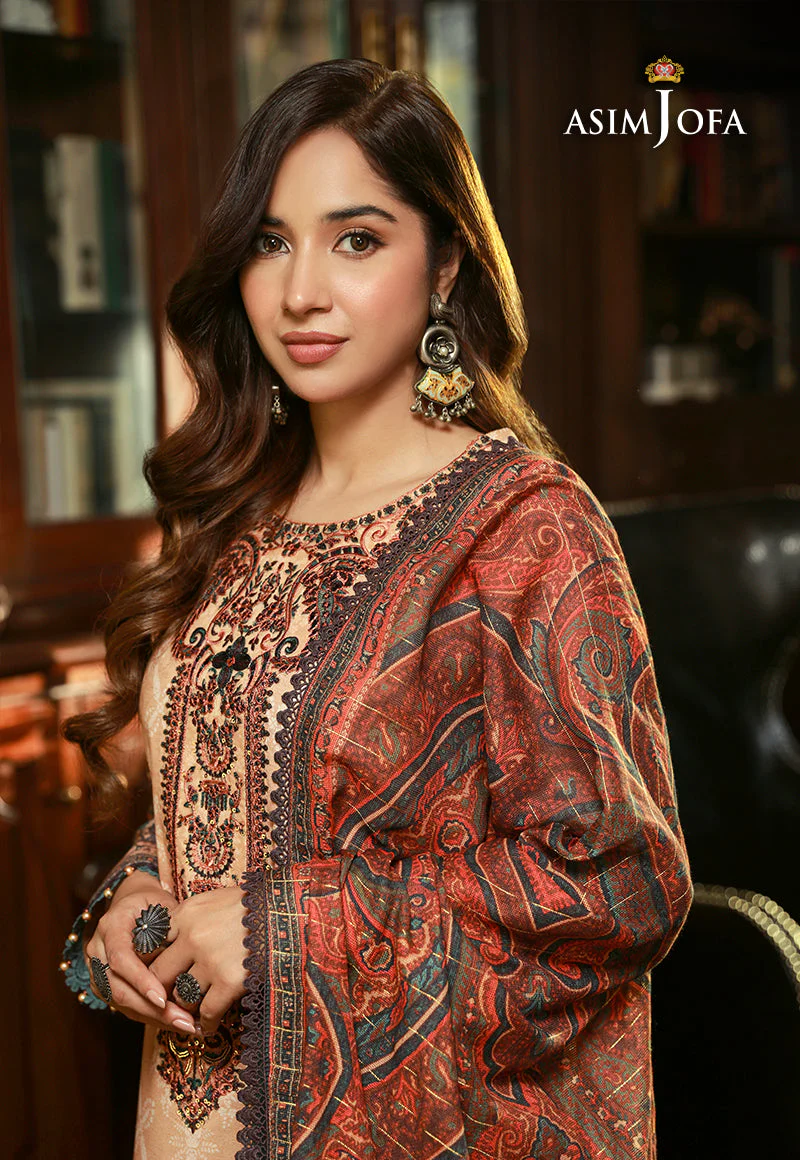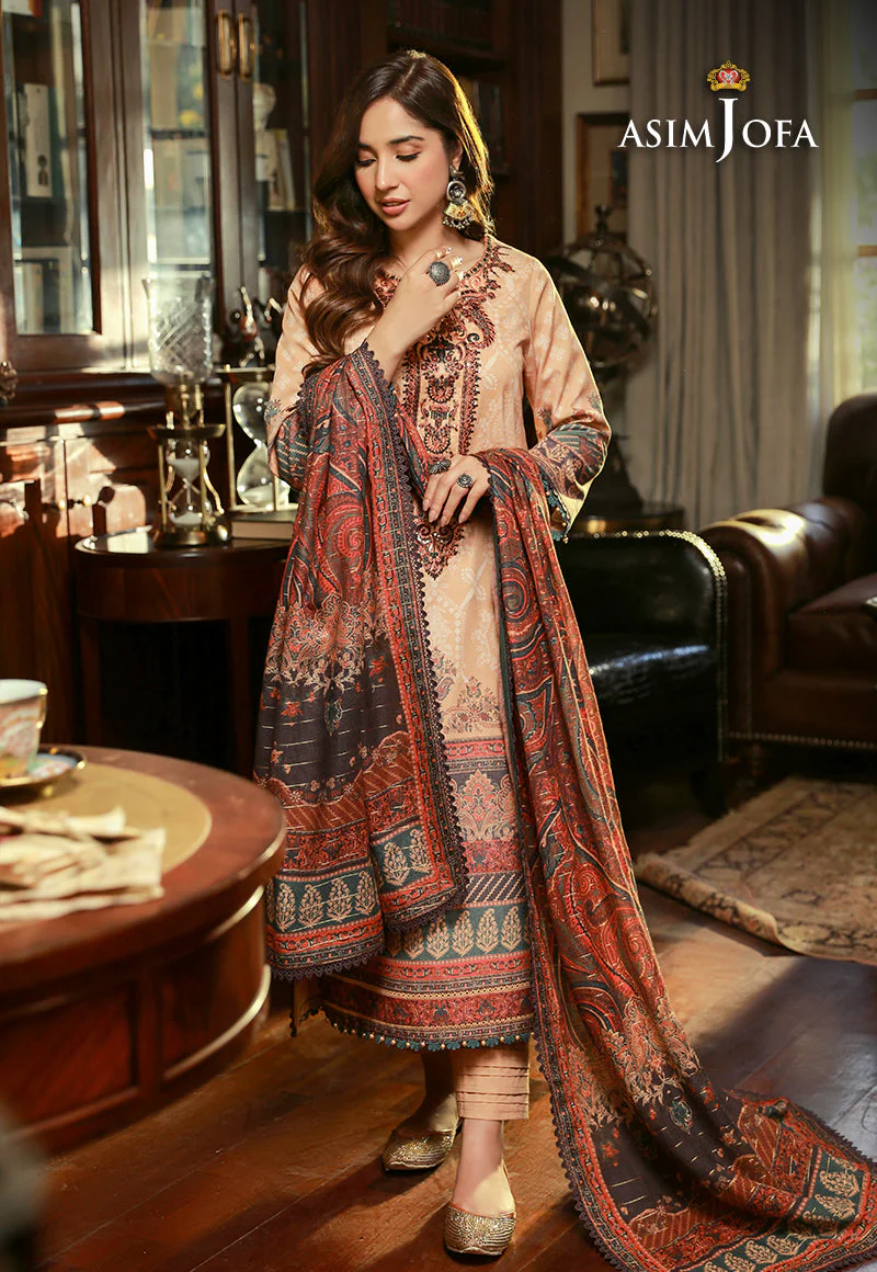 Step into a world of timeless beauty with Asra – Winter Shawl Collection. This elegant beige creation paired with a mysorie shawl is like a serene winter’s melody resonating with grace. The beige ensemble is a tapestry of intricate embroidery and printed motifs, reminiscent of a delicate symphony in shades of pink and green gracefully weaving its melody along the neckline. This design celebrates the profound artistic heritage and oozes sophistication. The mysorie shawl is adorned with contemporary motifs that paint a contrast that is as subtle as it is chic, adding depth to the ensemble’s poetic charm.