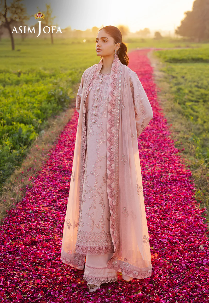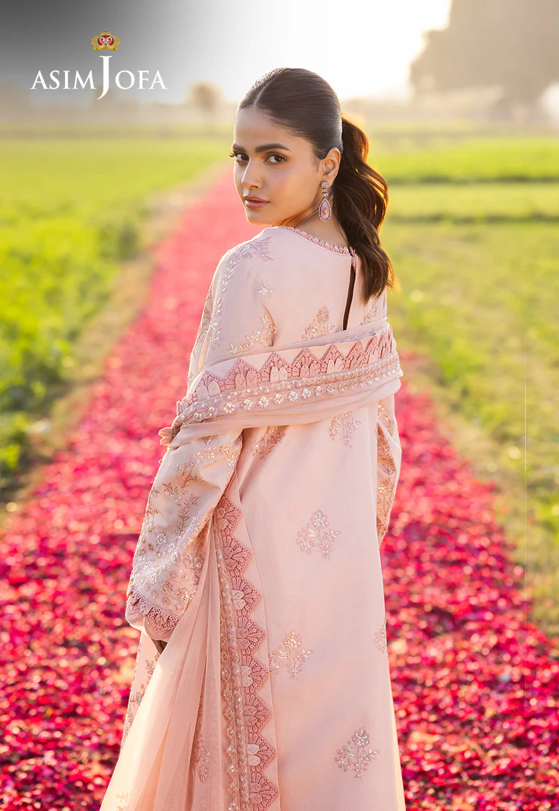 Like the first blush of a rose at dawn, this peach ensemble exudes elegance, capturing the tender beauty of nature in its most serene moments. The softly hued shirt, adorned with intricate embroidery in light and dark peach threads, glistens with light gold sequins, mirroring the golden dew that clings to petals at dawn. As if woven from the whispers of a dreamy garden, the embroidered dupatta drapes like a soft breeze, celebrating femininity, grace, and the timeless allure of nature’s most enchanting hues.