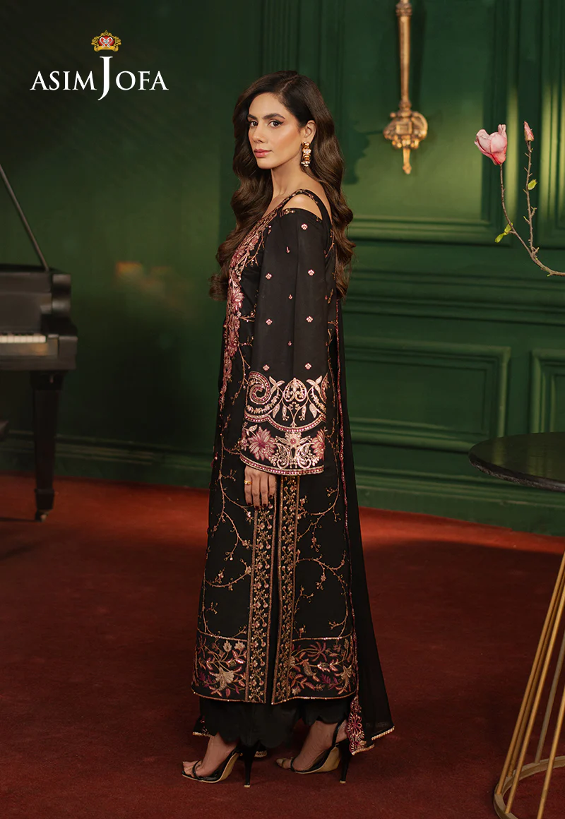 Exuding timeless allure, this black ensemble is perfection sewed into fabric. The embroidered shirt captivates with a stunning floral neckline, while the scalloped embroidery on the sleeve hems adds a touch of refinement. Magenta and pink threadwork intertwines beautifully with light gold zari and cupped sequins, creating a striking contrast against the dark canvas. Completing the look is a delicate, airy dupatta with an intricately embroidered border, adding an ethereal charm to this sophisticated masterpiece.