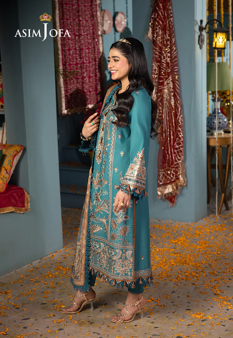 Indulge in the serene elegance of teal with Asim Jofa’s “Asra Collection.” This ensemble is a masterpiece of embroidered artistry featuring a shirt adorned with a detailed daman and borders that tell a story of timeless heritage. The sleeves are framed with an embroidered border adding a touch of sophistication. The ensemble is completed with a digital lurex jacquard dupatta which drapes like a dream reflecting the collection’s commitment to marrying tradition with contemporary chic.