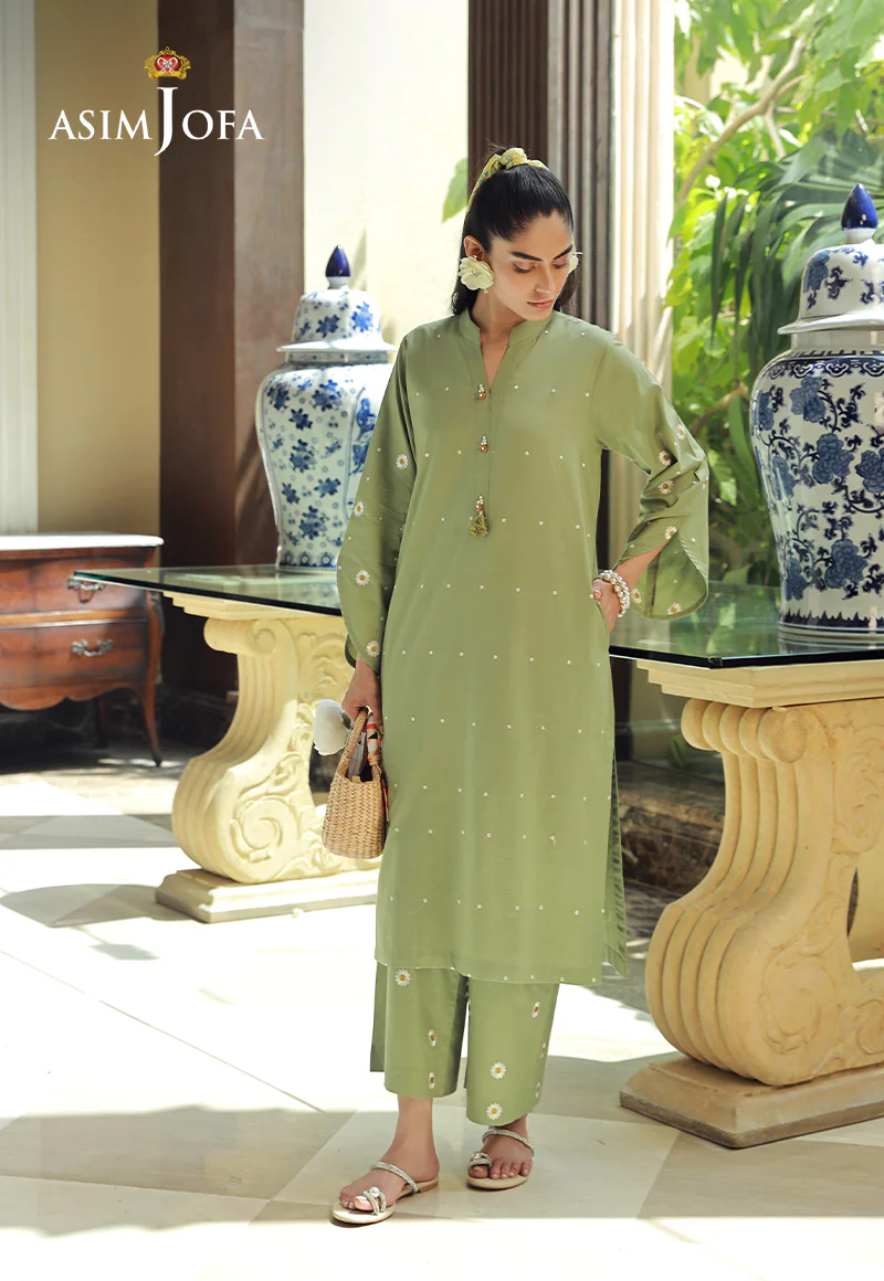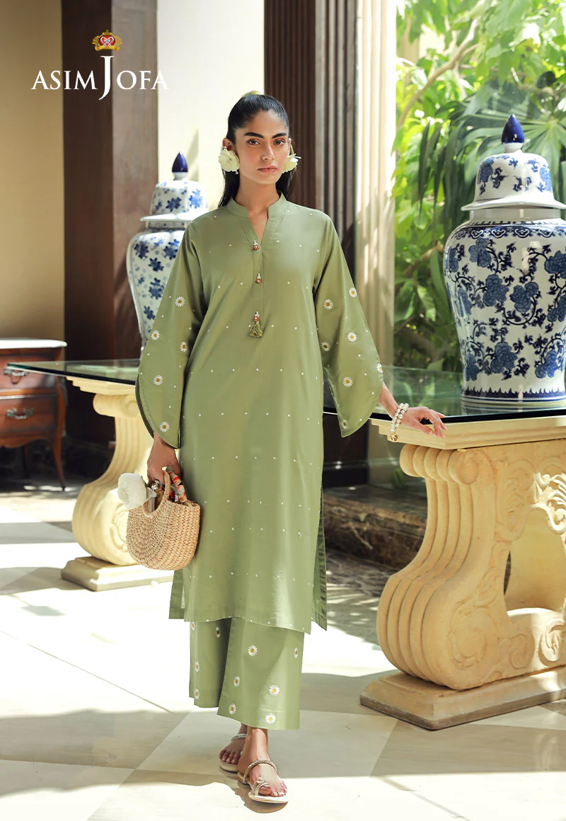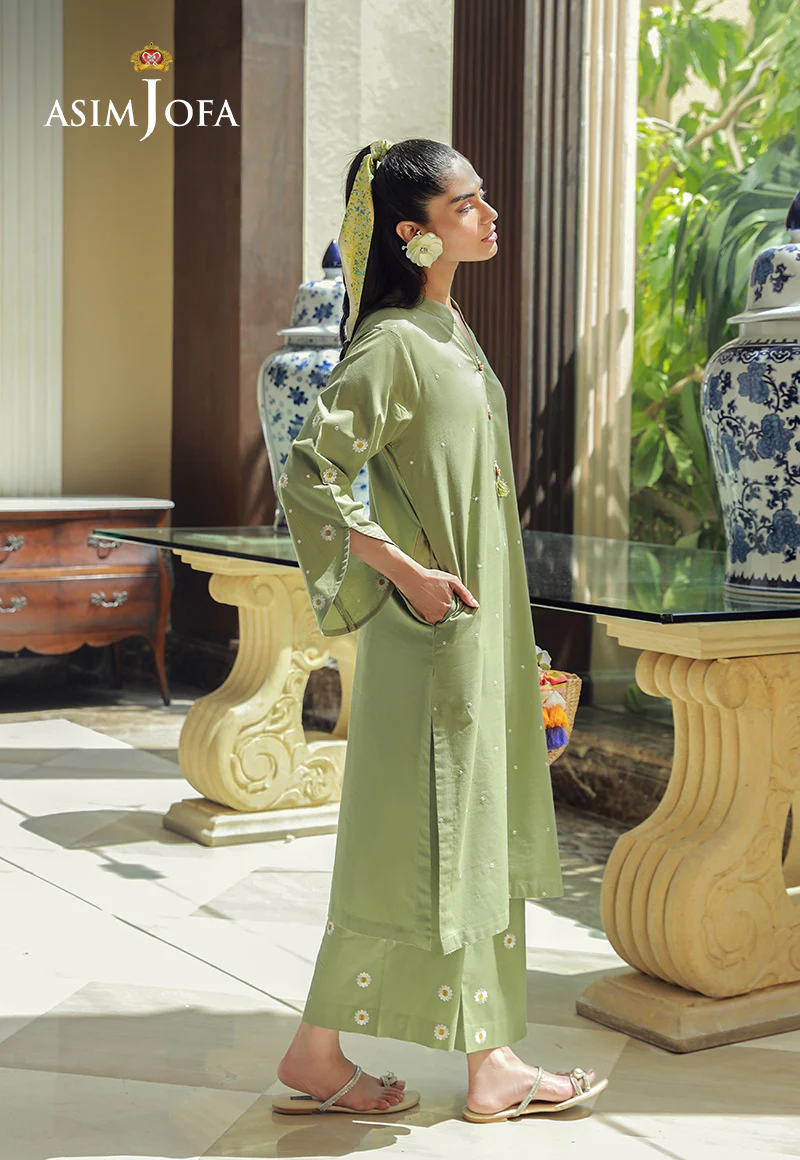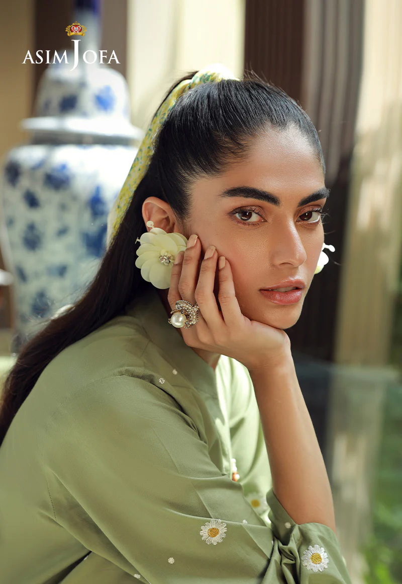 Embrace a touch of spring freshness in this pastel green ensemble. The stunning dotted shirt features beautiful sleeves, adorned with intricate daisy patterns, like a blooming garden on your arms. The matching trousers, featuring a subtle daisy motif, complete the look, creating a harmonious and feminine ensemble.