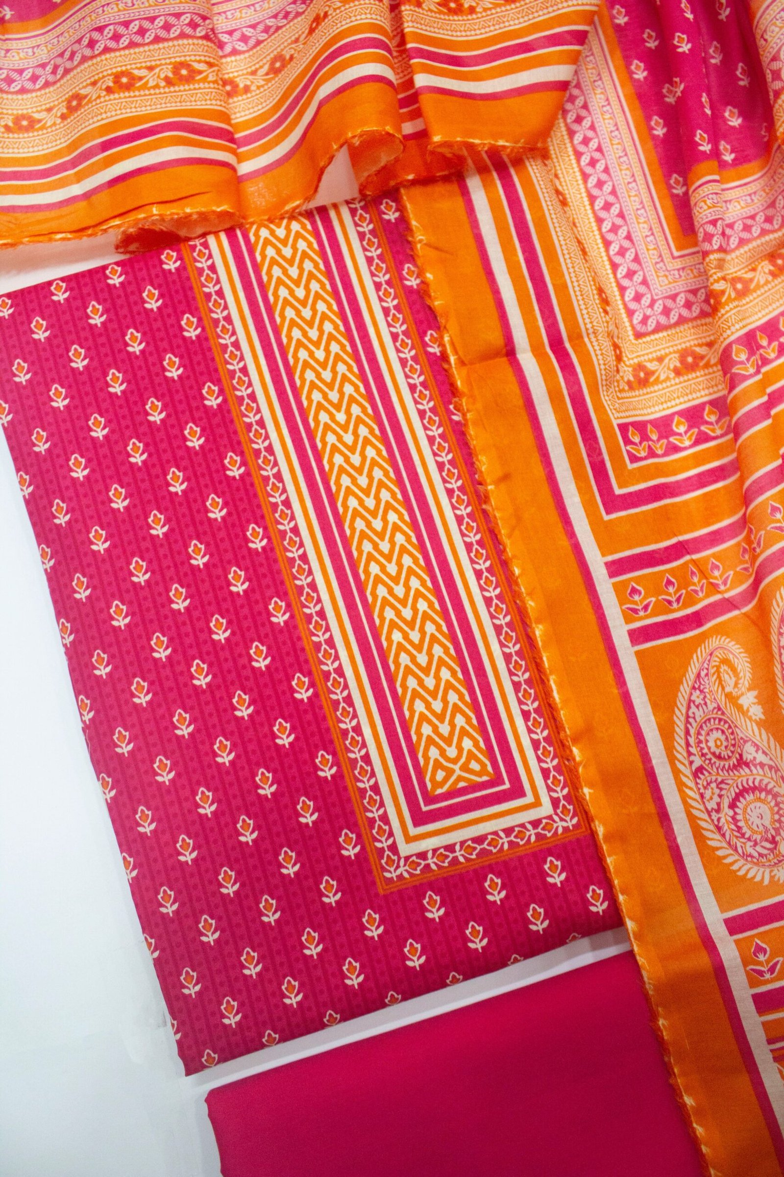 3 Piece shocking Pink Color Cotton Digital Printed UnStitched Suit with Printed Dupatta & Plain Trouser.