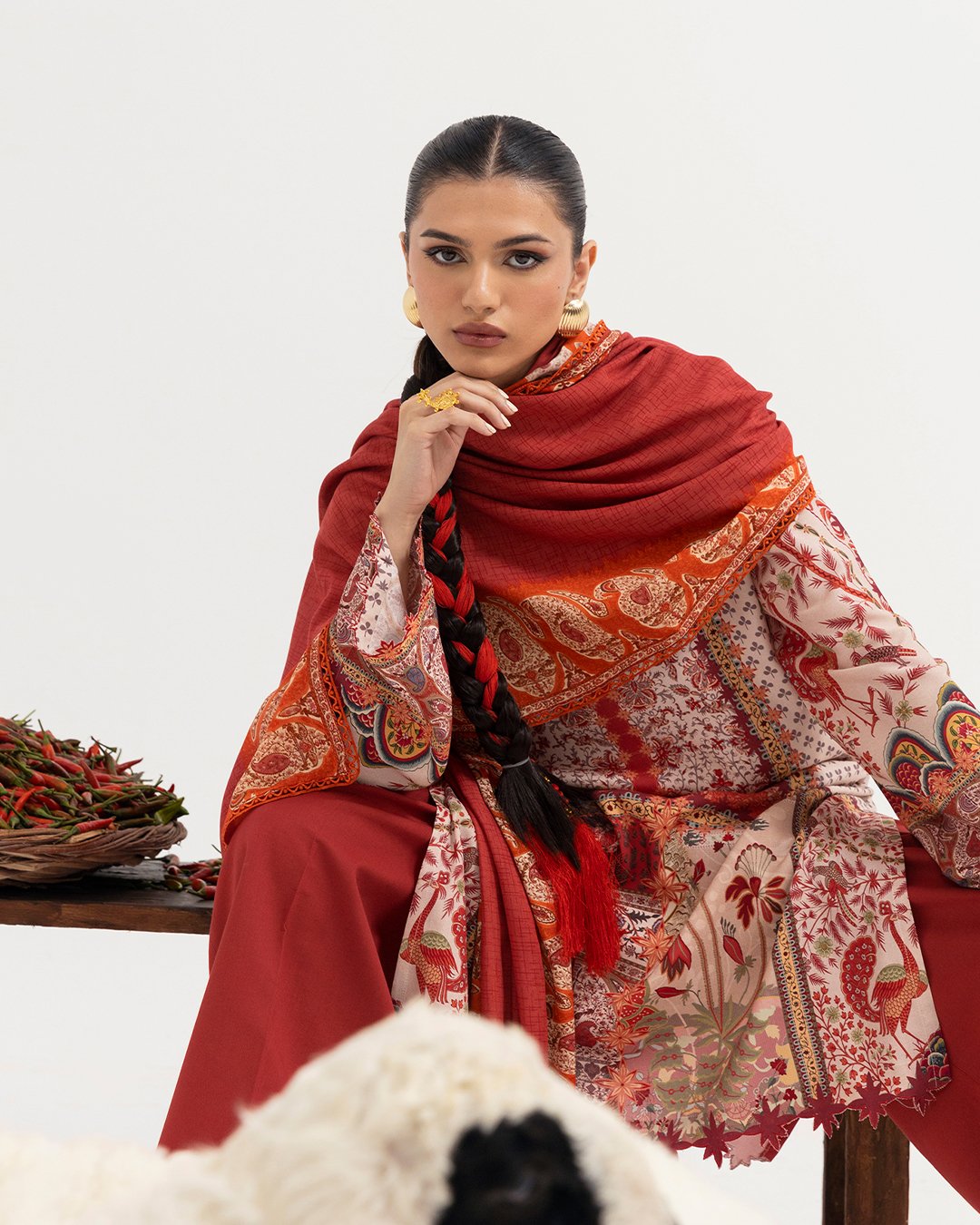 A digital-printed fusion of paisley and Mughal art in blush, terracotta, and orange, paired with a paisley rotary-print dupatta and matching pants.